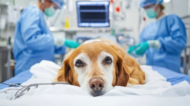 Animal healthcare includes emergency care A dog receiving veterinary care in a clinic with professionals in scrubs and masks.