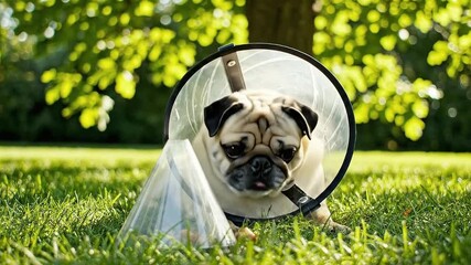Pug Dog Wearing Elizabethan Collar Sitting On Green Grass Outdoors During Daytime Facing Camera