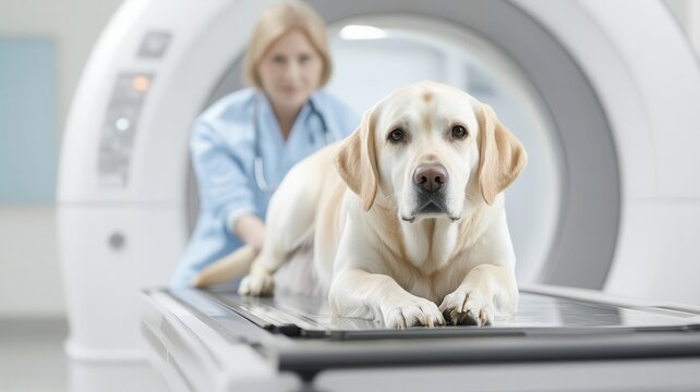 Beautiful woman veterinarian doctor with dog, copy space. Created using generative AI technology.
