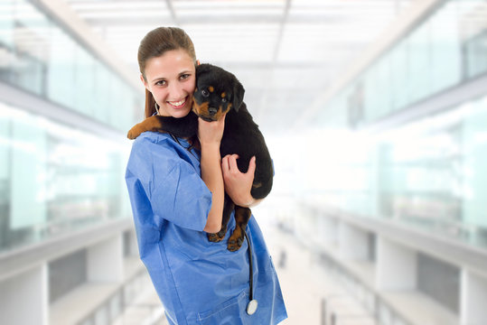 Veterinary doctor examining puppy for comprehensive pet care promotion