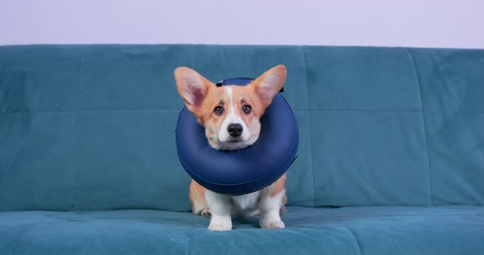Welsh corgi Pembroke or cardigan puppy with protective inflatable collar around its neck, or foam pillow inside casing. Sick dog obediently sits on couch. Equipment for rehabilitation after surgery
