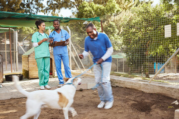 Dog, veterinary and healthcare doctor or team with tablet, writing notes for animals medical check, support and puppy care. Nonprofit volunteer people helping with pet care at dogs homeless community