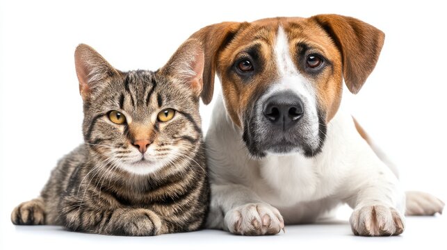 A playful dog and a curious cat rest closely together on a clean well lit surface. Their calm expressions highlight their friendship and comfort with each other.