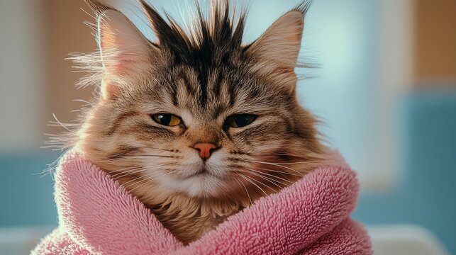 Cat is wrapped in a pink towel and has a look of annoyance on its face. Concept of humor and playfulness, as the cat is not typically seen wearing a towel or being wrapped up in one