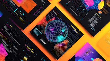 Retro futuristic vibe announcement flyers set. Vector realistic illustration of y2k aesthetic techno banners, retrowave style poster with abstract geometric lines, wireframe globe on orange background