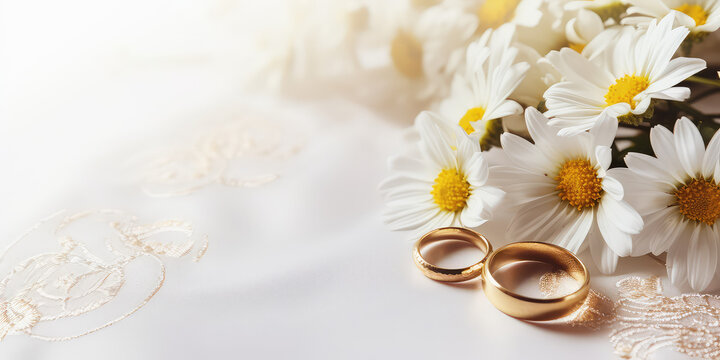 Wedding ring with daisy flowers, minimal banner template, top view, copy space.