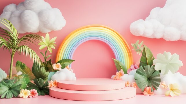 Retro-futuristic white podium in synthwave style with neon accents and vibrant contrasts.