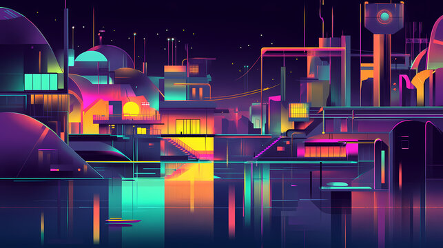 A futuristic cityscape at night with vibrant neon accents and reflective surfaces. Reflective. Illustration