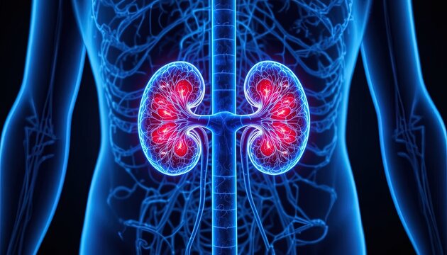 Detailed kidney anatomy illustration with vibrant red and blue tones shows human organ health and function for medical or educational purposes
