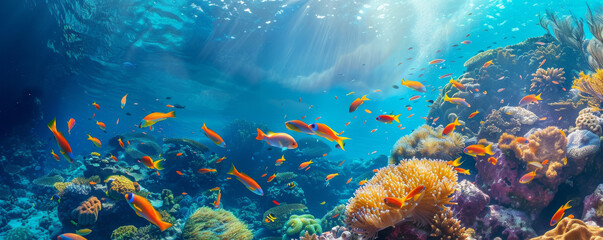 Summer background with a vibrant coral reef, colorful fish, and clear blue ocean water: Dynamic and lively, perfect for an underwater summer adventure