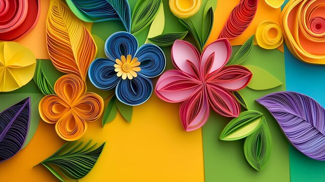 Flower and nature paper quilling concept. Colorful quilling art featuring vibrant flowers and leaves on a bright background.