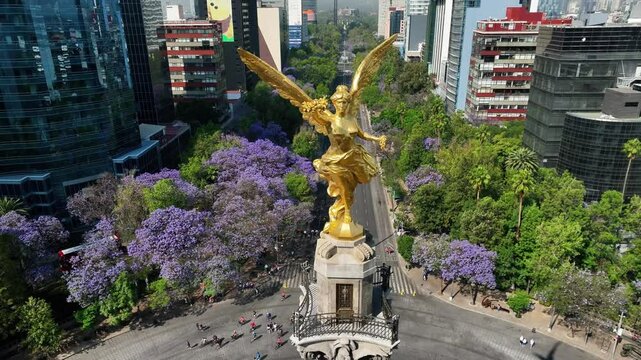 Aerial view of the iconic angel of independence surrounded by jacaranda trees and modern skyscrapers in a vibrant urban landscape, Cuauhtemoc, Mexico.