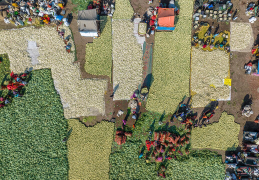 Bogura, Bangladesh - 27 November 2019: Aerial view of fields bursting with vibrant green crops, contrasted by patches of drying produce under the open sky, as workers busily attend to the harvest.
