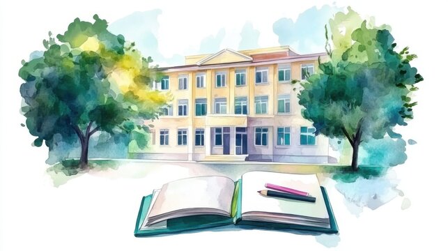 A vibrant watercolor illustration of a school building surrounded by trees, featuring an open book and a pen in the foreground.