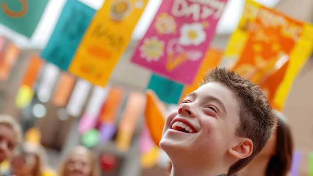 This is a of a young boy laughing joyfully while attending a public event, such as a parade or festival. The background is filled with vibrant banners and flags.