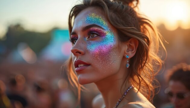 Young woman with vibrant glitter face paint attends outdoor music festival. Gazes afar, enjoying event atmosphere. Colorful makeup complements style at summer gathering under warm sunset light.