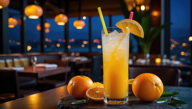 Glass of orange cocktail with vibrant straws surrounded by fresh oranges in upscale restaurant setting at night.