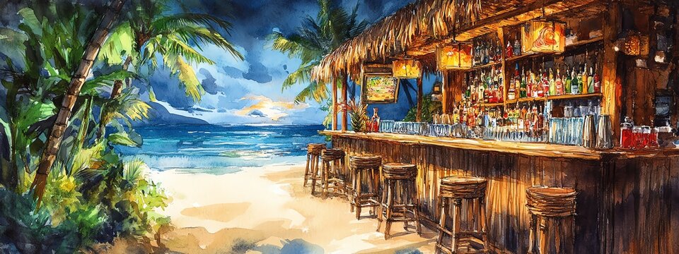 A vibrant beach bar scene with tropical ambiance, showcasing colorful drinks, palm trees, and a stunning ocean view.