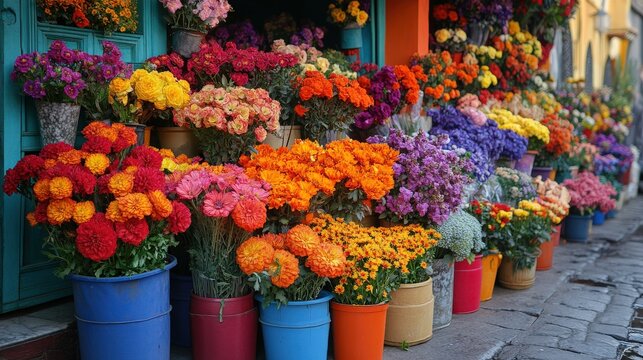 A lively and colorful flower market scene, featuring a variety of vibrant bouquets and floral arrangements, with bright colors and cheerful ambiance