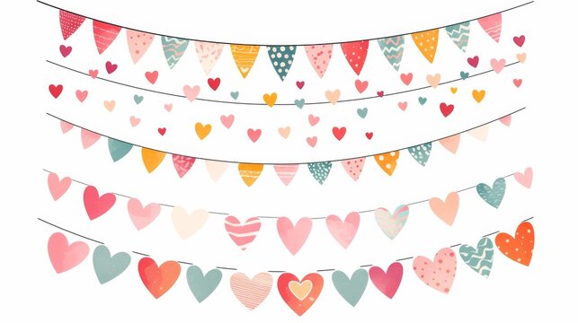 Festive bunting and garland set on white background, featuring cute party flags and holiday decorations, perfect for Valentine's Day, celebrations, and cheerful event themes.