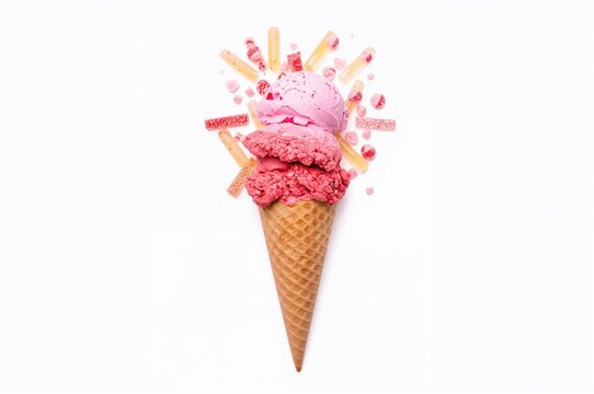 Gummy Candy Topped Ice Cream Cone from Above. Holiday and Celebration Theme with Vibrant Pink Sweets. Chic and Simple Design.
