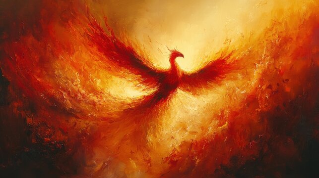 Dynamic oil ink art of a phoenix rising in vibrant reds and yellows positioned from a wide-angle to capture the movement and energy in the piece