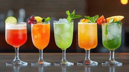 Colorful cocktails with ice and garnish on a bar counter, showcasing a vibrant and refreshing selection perfect for a lively and inviting atmosphere.