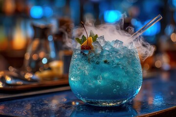 Magical blue cocktail with swirling dry ice smoke on a bar counter, ready for a drink.