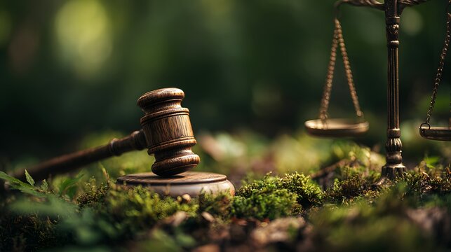 Wooden gavel and antique balance scales rest upon vibrant green moss in a shadowy forest setting