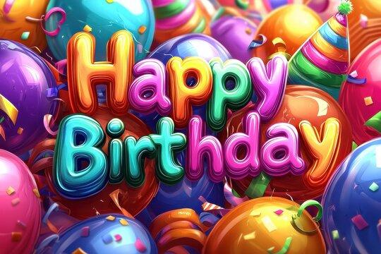 Colorful 'Happy Birthday' text with balloons on a pink background