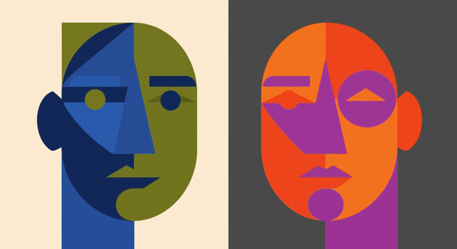 Abstract Geometric Portraits Depicting Duality and Contrast, Designed for Modern Art Prints, Editorial Illustrations, and Creative Design Projects, Exploring Human Emotion and Identity