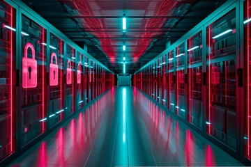 Digital security scene with a glowing, vibrant lock graphic, illustrating strong defense mechanisms and modern cybersecurity solutions.