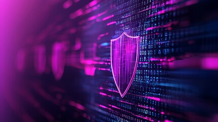 A digital shield emblem with vibrant pink and blue light trails, symbolizing cybersecurity and data protection.