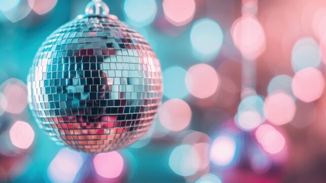 A shimmering disco ball is suspended against a dreamy bokeh background, creating a festive atmosphere that invites joy, nostalgia, and celebration in a vibrant display.