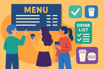 Vibrant Drink Selection. Colorful scene of people choosing drinks at menu board and options icon set for checkmarks, cup icons,