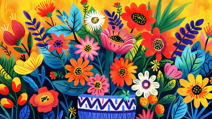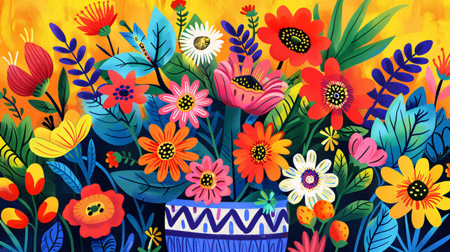 A vibrant and playful illustration of multiple flowers in a decorative pot, with bright colors and dynamic shapes