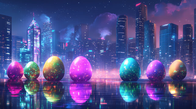 Futuristic easter landscape with colorful glowing eggs and vibrant urban skyline. Neon Dreamscape City. Illustration