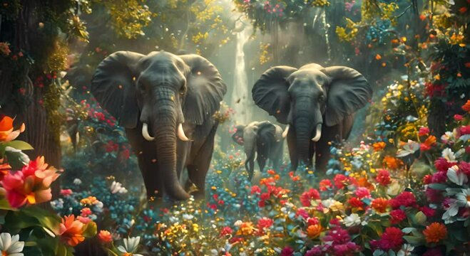 A vibrant photo of a group of elephants enjoying a bath in a river, surrounded by a lush tropical landscape