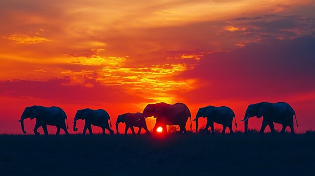 A herd of elephants silhouetted against a vibrant African sunset, walking towards the horizon