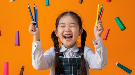 Kneeling and drawing with colorful crayons, an Asian girl in a school uniform smiles with pure joy against a vibrant orange background. Her creativity and engagement in art showcase the importance of