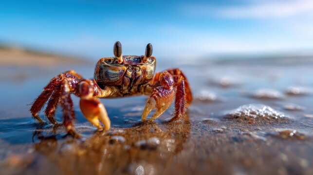 A vibrant crab confidently perches on the shore, its vivid colors and intricate patterns contrasting beautifully with the sandy beach and sparkling ocean water in the background.