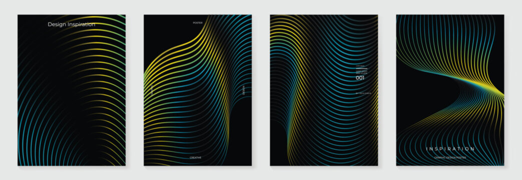 A vibrant collection of four abstract poster designs featuring bold colors and geometric shapes. Each poster showcases unique themes such as curves, lines, color blocks, and display elements