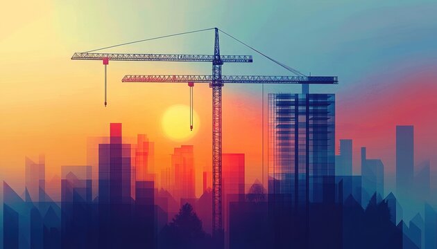 Silhouetted construction cranes and partially built skyscrapers against a vibrant orange and blue sunset over a city skyline, evoking progress and calm