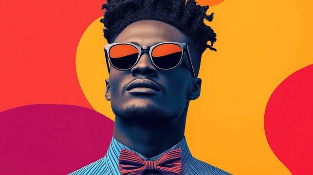 Stylized portrait of a man wearing sunglasses and a bow tie with vibrant abstract background
