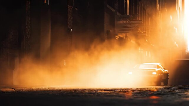 Retro car in city alleyway. Taillights glow through dramatic dust and shadows. A vintage car exudes power and classic style.