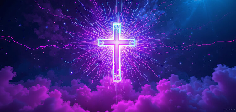A glowing cross emits radiant light against a dark, starry sky. Surrounded by vibrant purple and blue clouds, the scene exudes a sense of power and spirituality at night