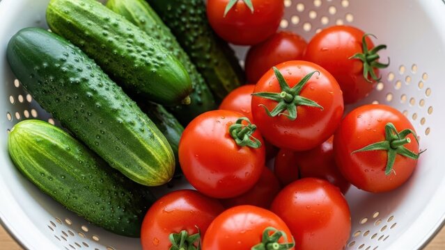 Fresh Tomatoes and Cucumber: A vibrant display of ripe, juicy tomatoes and crisp cucumbers, artfully arranged in a colander, exuding the essence of freshness and healthy eating.
