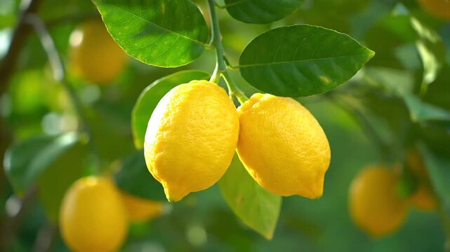 A vibrant close-up shot captures two ripe lemons hanging and growing, surrounded by lush green foliage in a sunny mediterranean orchard, exuding a fresh, sunny yellow color.