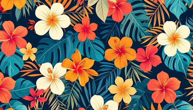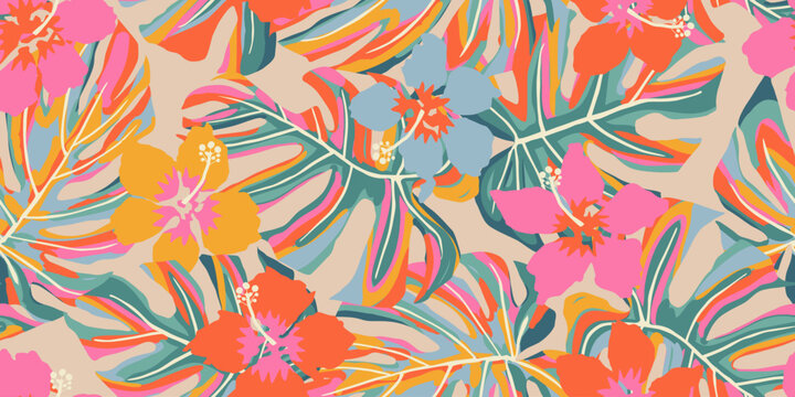 Hand drawn tropical flowers, seamless patterns with floral for fabric, textiles, clothing, wrapping paper, cover, banner, interior decor, abstract backgrounds. vector illustration.