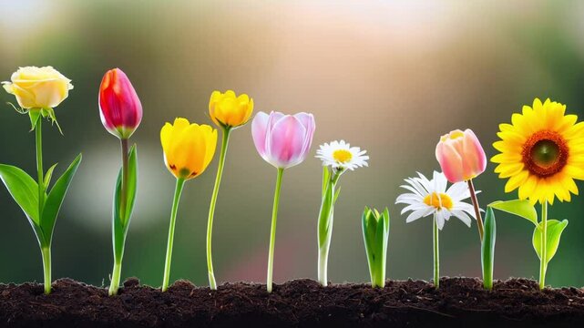 Various colorful flowers growing from soil in different stages of blooming, nature concept with blurred background, springtime floral beauty